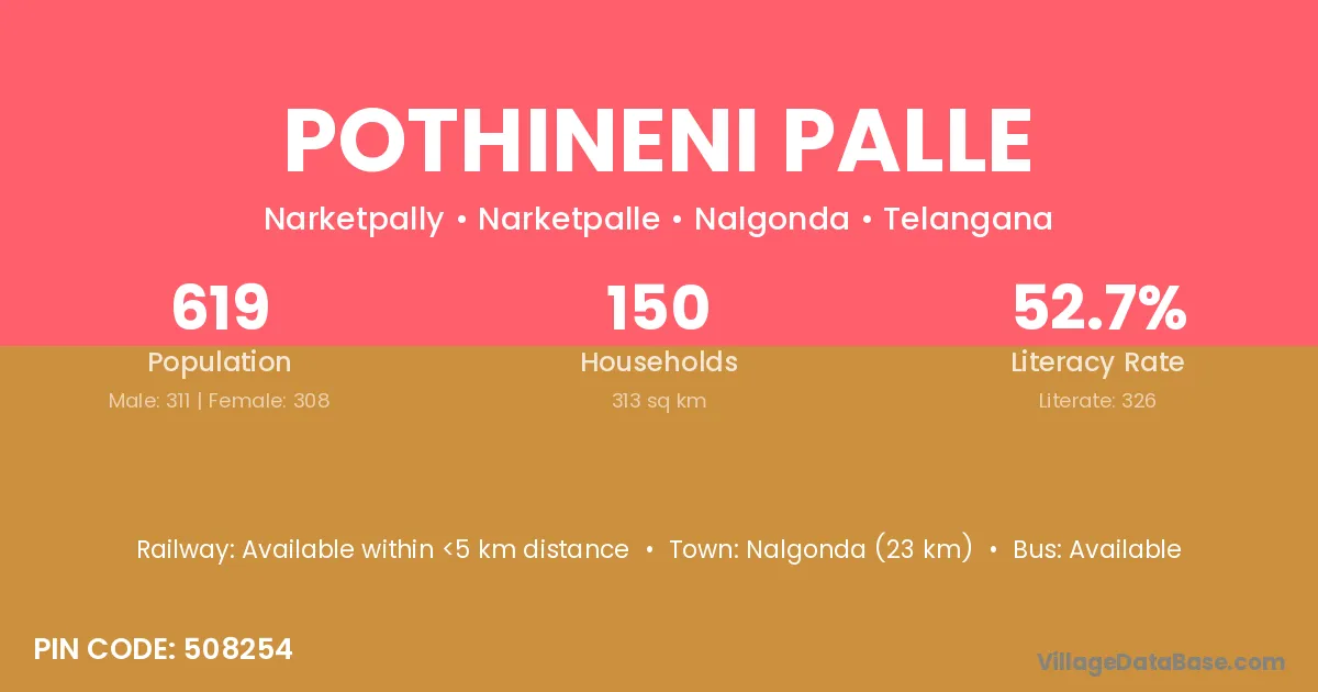 Nalgonda (23 km) is the nearest town to Pothineni Palle village for major economic activities and is located approximately 23 km away.