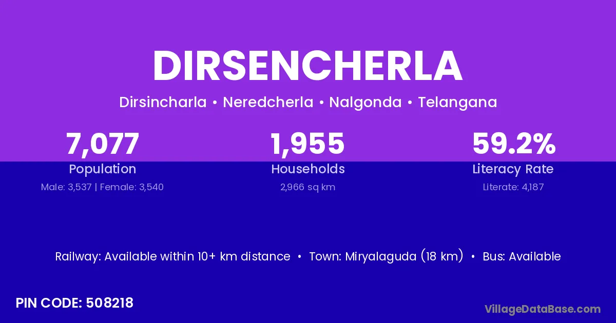 Miryalaguda (18 km) is the nearest town to Dirsencherla village for major economic activities and is located approximately 18 km away.