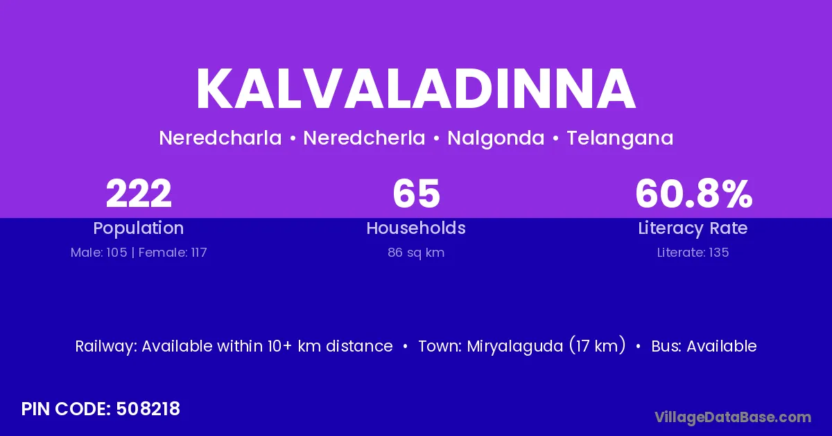 Miryalaguda (17 km) is the nearest town to Kalvaladinna village for major economic activities and is located approximately 17 km away.