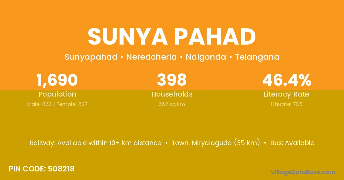 Miryalaguda (35 km) is the nearest town to Sunya Pahad village for major economic activities and is located approximately 35 km away.