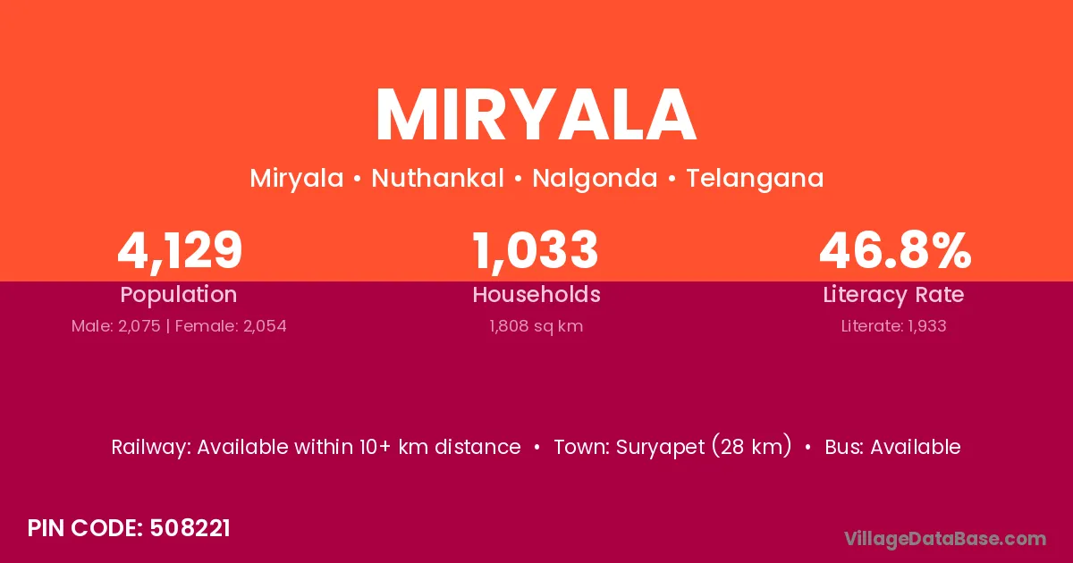 According to Census 2011 information, the village code of Miryala village is 508221.