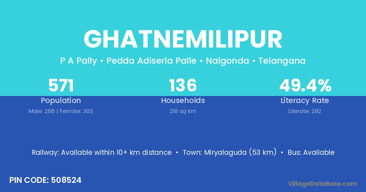 Miryalaguda (53 km) is the nearest town to Ghatnemilipur village for major economic activities and is located approximately 53 km away.
