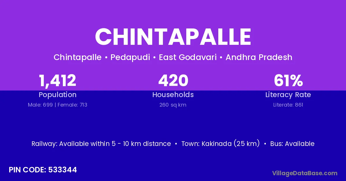 The literacy rate of Chintapalle village is 38.88%. Male literacy stands at 48.56% and female literacy at 29.04%.