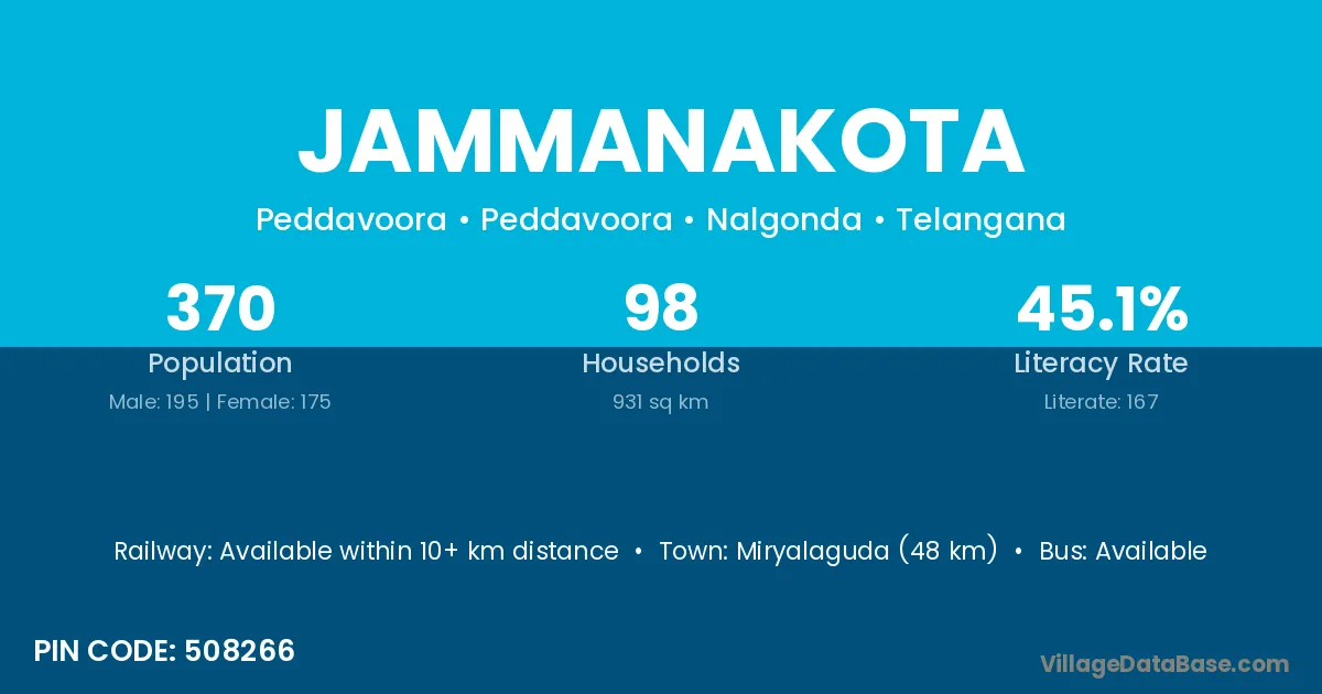 Miryalaguda (48 km) is the nearest town to Jammanakota village for major economic activities and is located approximately 48 km away.