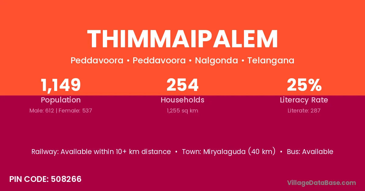 Miryalaguda (40 km) is the nearest town to Thimmaipalem village for major economic activities and is located approximately 40 km away.