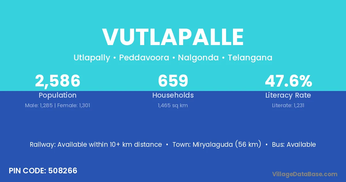 Miryalaguda (56 km) is the nearest town to Vutlapalle village for major economic activities and is located approximately 56 km away.