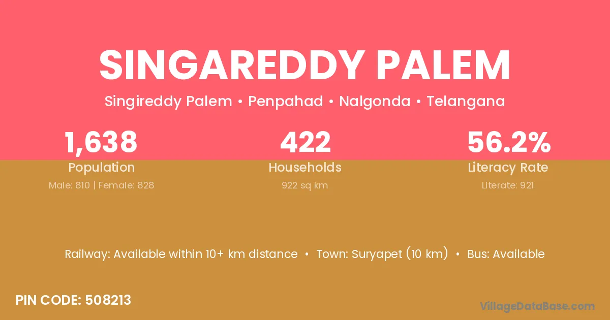 Suryapet (10 km) is the nearest town to Singareddy Palem village for major economic activities and is located approximately 10 km away.