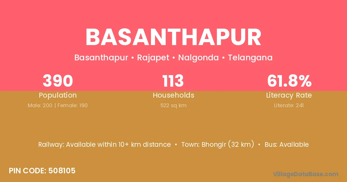 Bhongir (32 km) is the nearest town to Basanthapur village for major economic activities and is located approximately 32 km away.