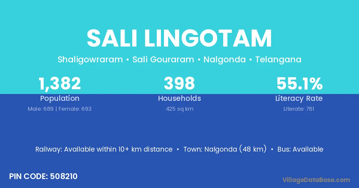 Nalgonda (48 km) is the nearest town to Sali Lingotam village for major economic activities and is located approximately 48 km away.