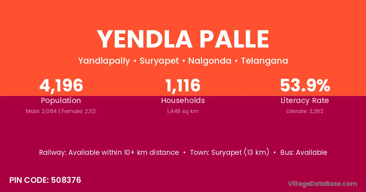 Suryapet (13 km) is the nearest town to Yendla Palle village for major economic activities and is located approximately 13 km away.