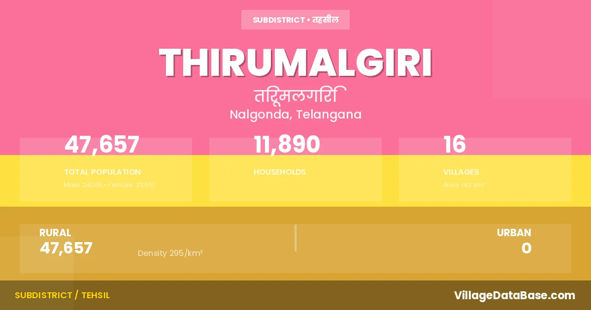 According to the 2011 census The total area of Thirumalgiri Mandal is 162 km², with a population of 47657 people. The population density is 295 inhabitants per square kilometre, and there are approximately 11890 houses in the sub district.