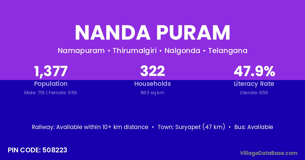 Suryapet (47 km) is the nearest town to Nanda Puram village for major economic activities and is located approximately 47 km away.