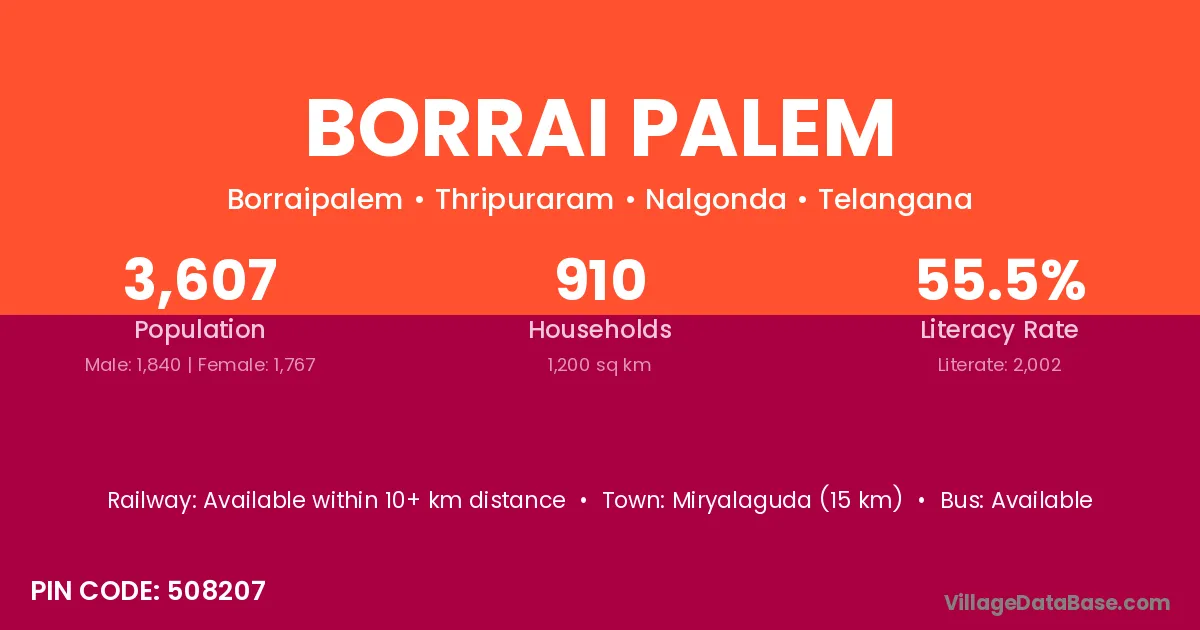 Miryalaguda (15 km) is the nearest town to Borrai Palem village for major economic activities and is located approximately 15 km away.