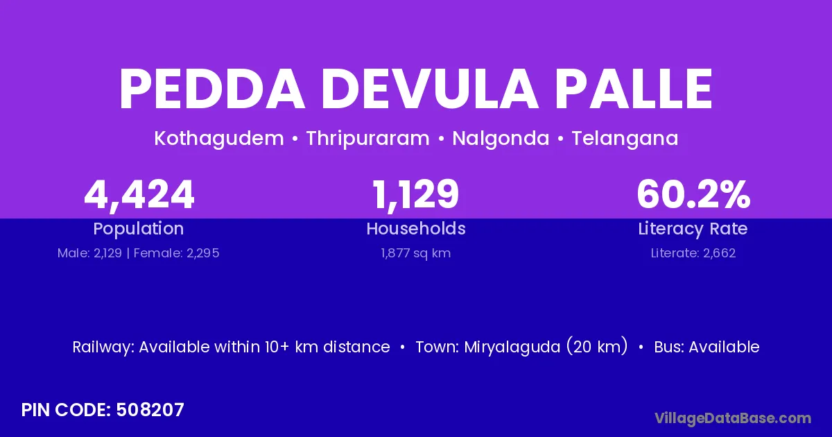 Miryalaguda (20 km) is the nearest town to Pedda Devula Palle village for major economic activities and is located approximately 20 km away.