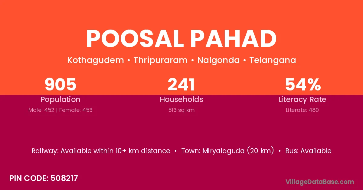 Miryalaguda (20 km) is the nearest town to Poosal Pahad village for major economic activities and is located approximately 20 km away.