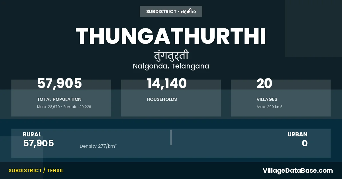 According to the 2011 census The total area of Thungathurthi Mandal is 209 km², with a population of 57905 people. The population density is 277 inhabitants per square kilometre, and there are approximately 14140 houses in the sub district.
