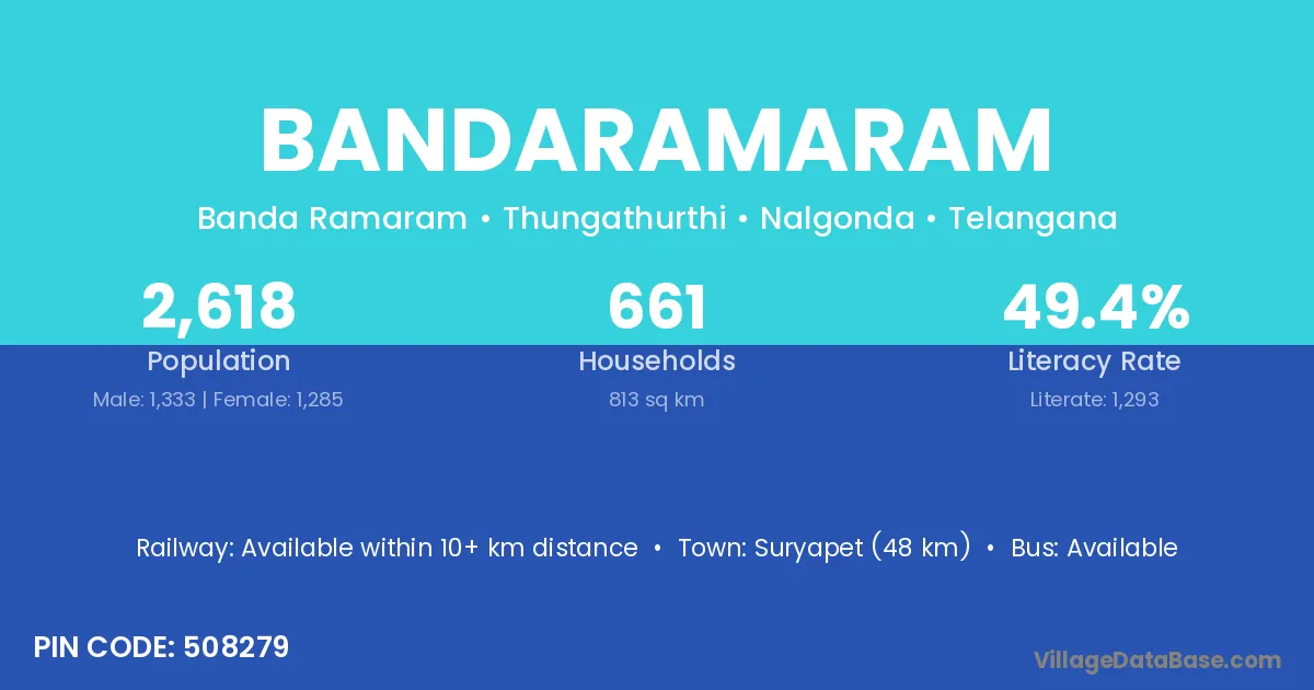 Suryapet (48 km) is the nearest town to Bandaramaram village for major economic activities and is located approximately 48 km away.