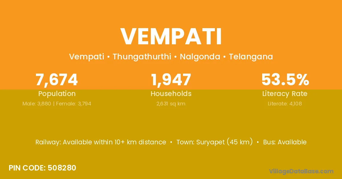 Suryapet (45 km) is the nearest town to Vempati village for major economic activities and is located approximately 45 km away.