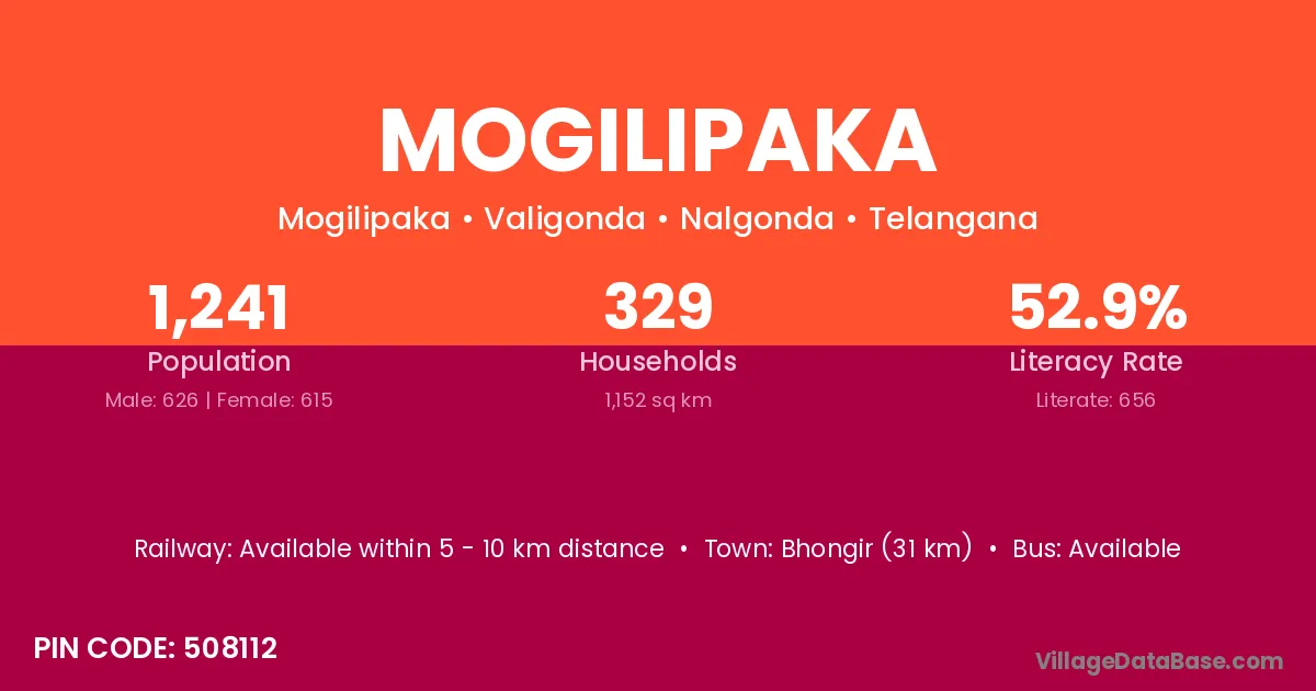 Bhongir (31 km) is the nearest town to Mogilipaka village for major economic activities and is located approximately 31 km away.