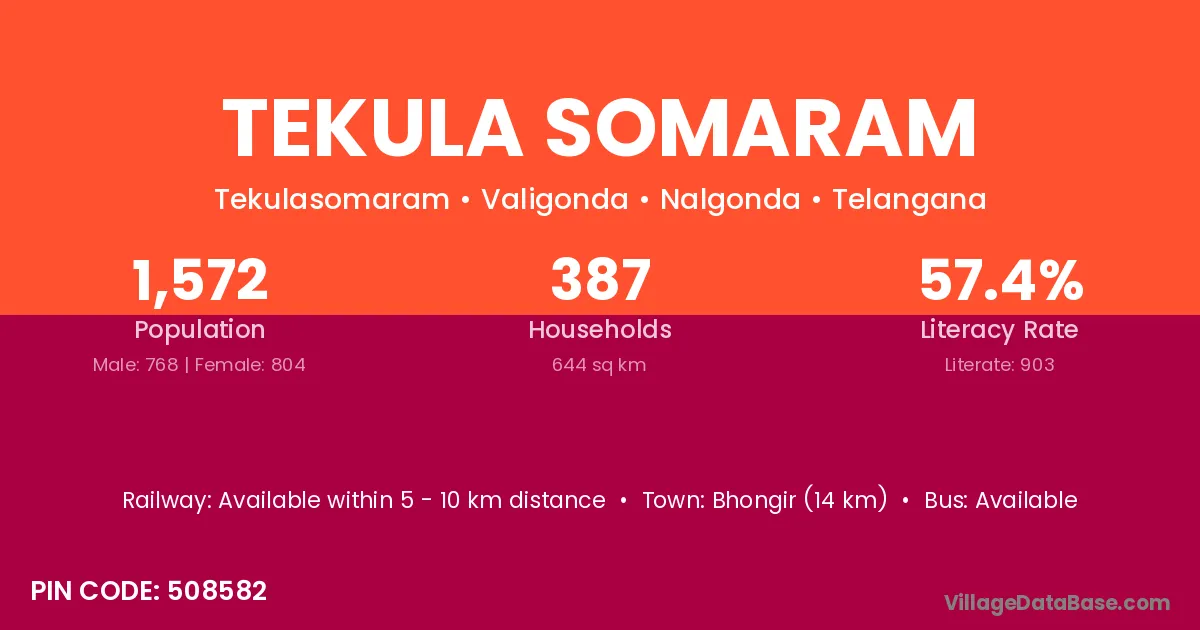 Bhongir (14 km) is the nearest town to Tekula Somaram village for major economic activities and is located approximately 14 km away.