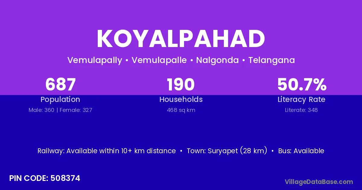 Suryapet (28 km) is the nearest town to Koyalpahad village for major economic activities and is located approximately 28 km away.