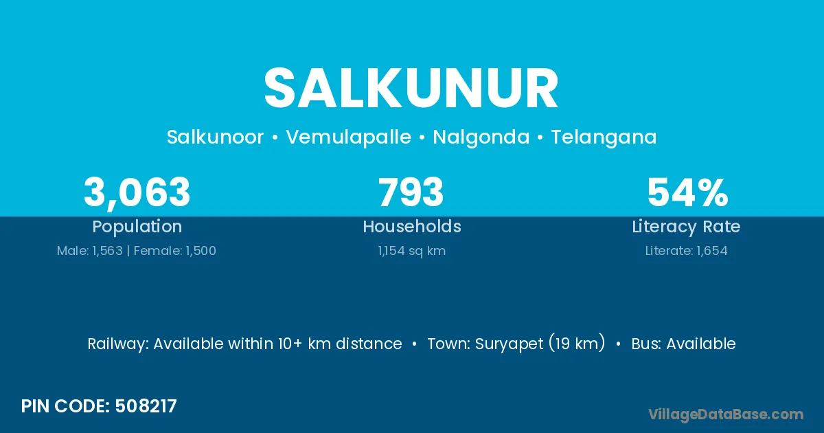 Suryapet (19 km) is the nearest town to Salkunur village for major economic activities and is located approximately 19 km away.