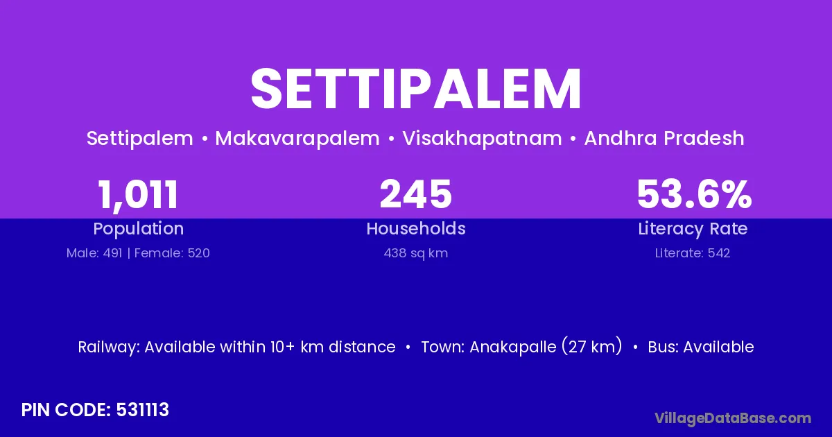 The literacy rate of Settipalem village is 62.04%. Male literacy stands at 70.65% and female literacy at 53.46%.