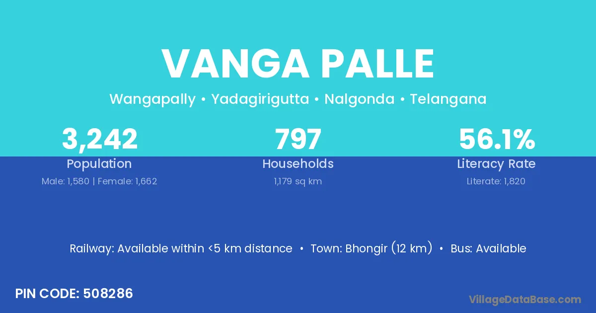 Bhongir (12 km) is the nearest town to Vanga Palle village for major economic activities and is located approximately 12 km away.