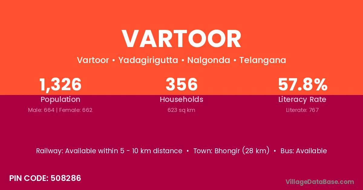 Bhongir (28 km) is the nearest town to Vartoor village for major economic activities and is located approximately 28 km away.