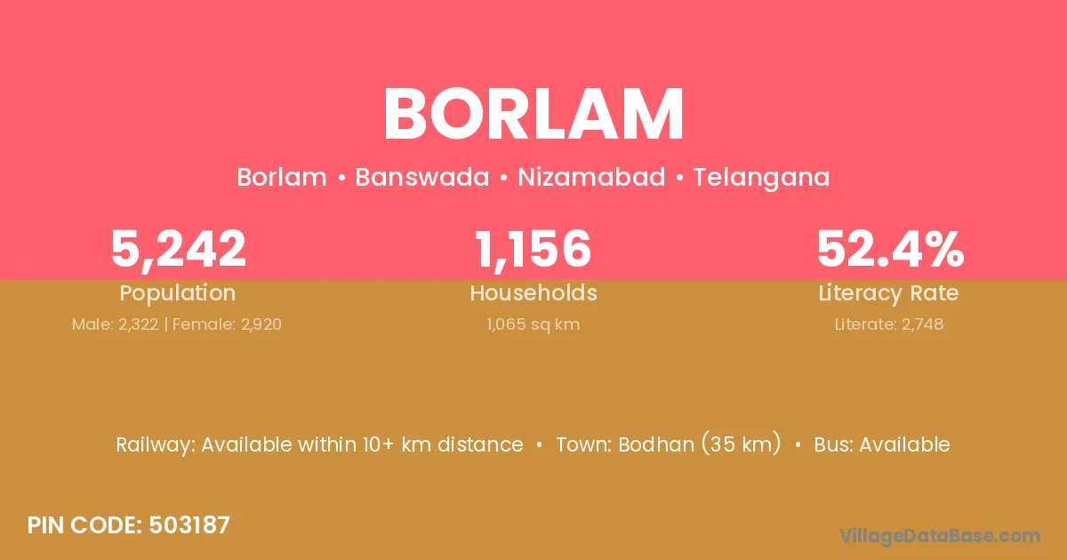 Bodhan (35 km) is the nearest town to Borlam village for major economic activities and is located approximately 35 km away.