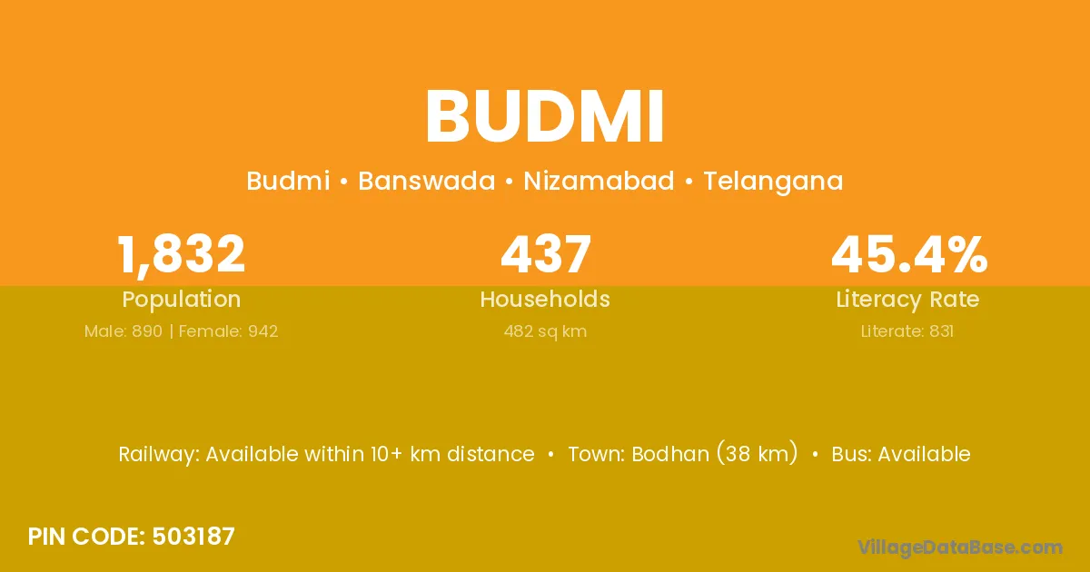 Bodhan (38 km) is the nearest town to Budmi village for major economic activities and is located approximately 38 km away.