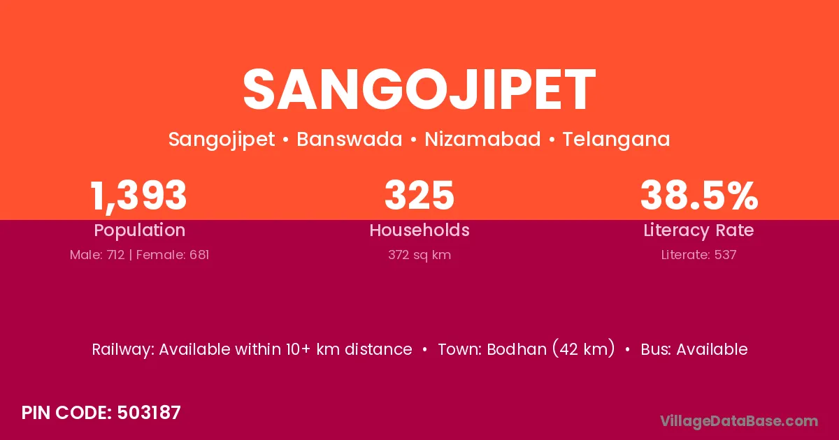 Bodhan (42 km) is the nearest town to Sangojipet village for major economic activities and is located approximately 42 km away.