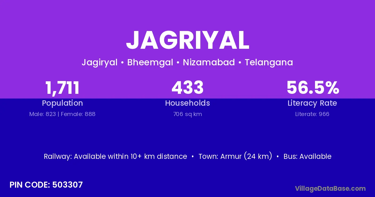 Armur (24 km) is the nearest town to Jagriyal village for major economic activities and is located approximately 24 km away.