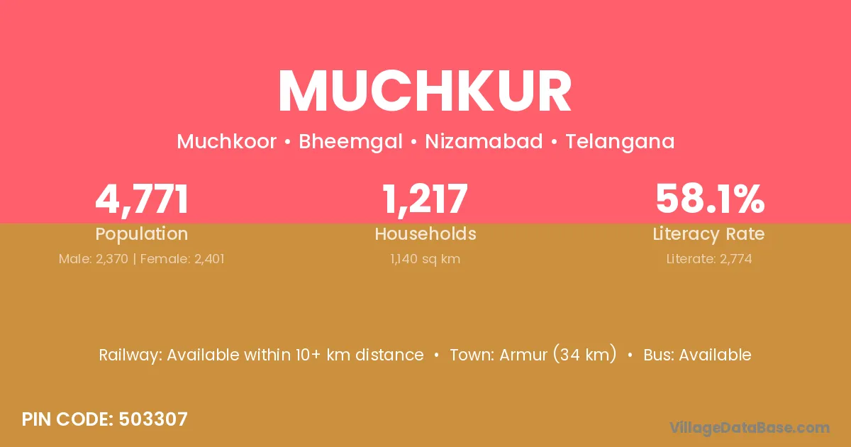Armur (34 km) is the nearest town to Muchkur village for major economic activities and is located approximately 34 km away.