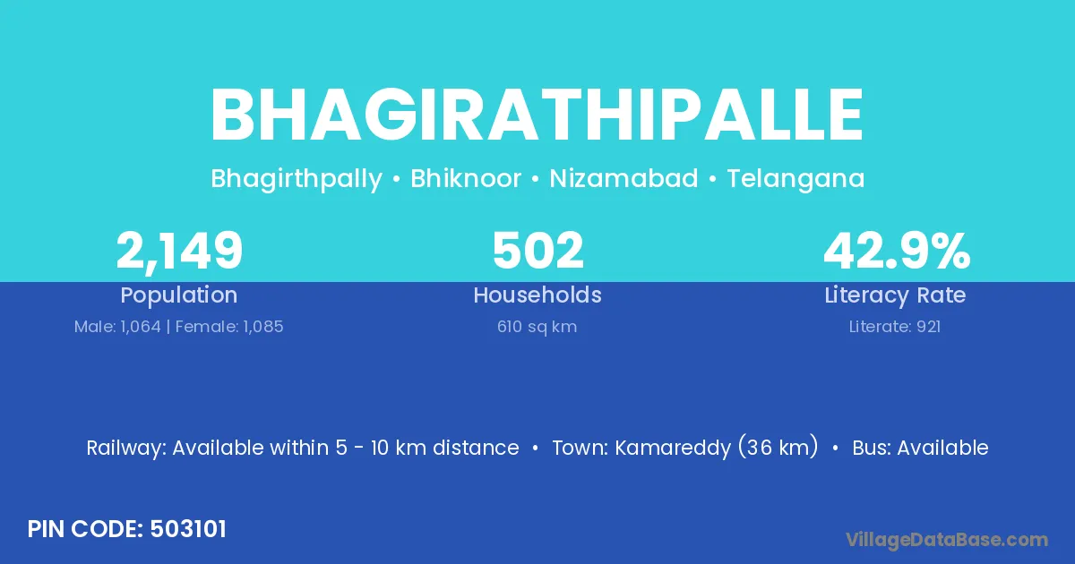 Kamareddy (36 km) is the nearest town to Bhagirathipalle village for major economic activities and is located approximately 36 km away.