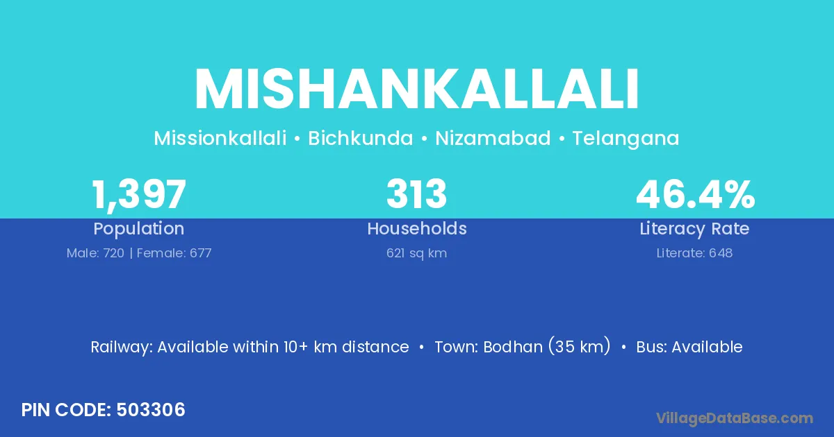 Bodhan (35 km) is the nearest town to Mishankallali village for major economic activities and is located approximately 35 km away.