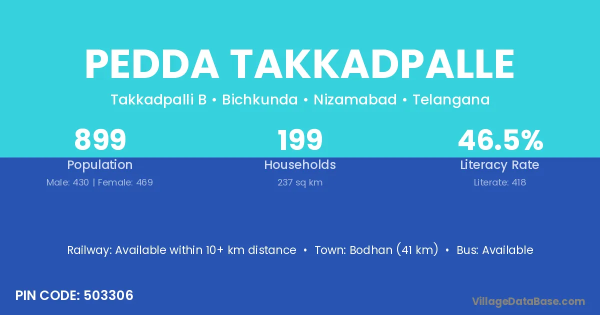 Bodhan (41 km) is the nearest town to Pedda Takkadpalle village for major economic activities and is located approximately 41 km away.