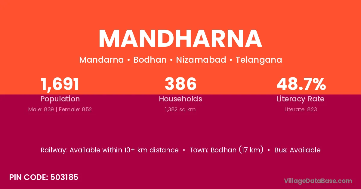 Bodhan (17 km) is the nearest town to Mandharna village for major economic activities and is located approximately 17 km away.