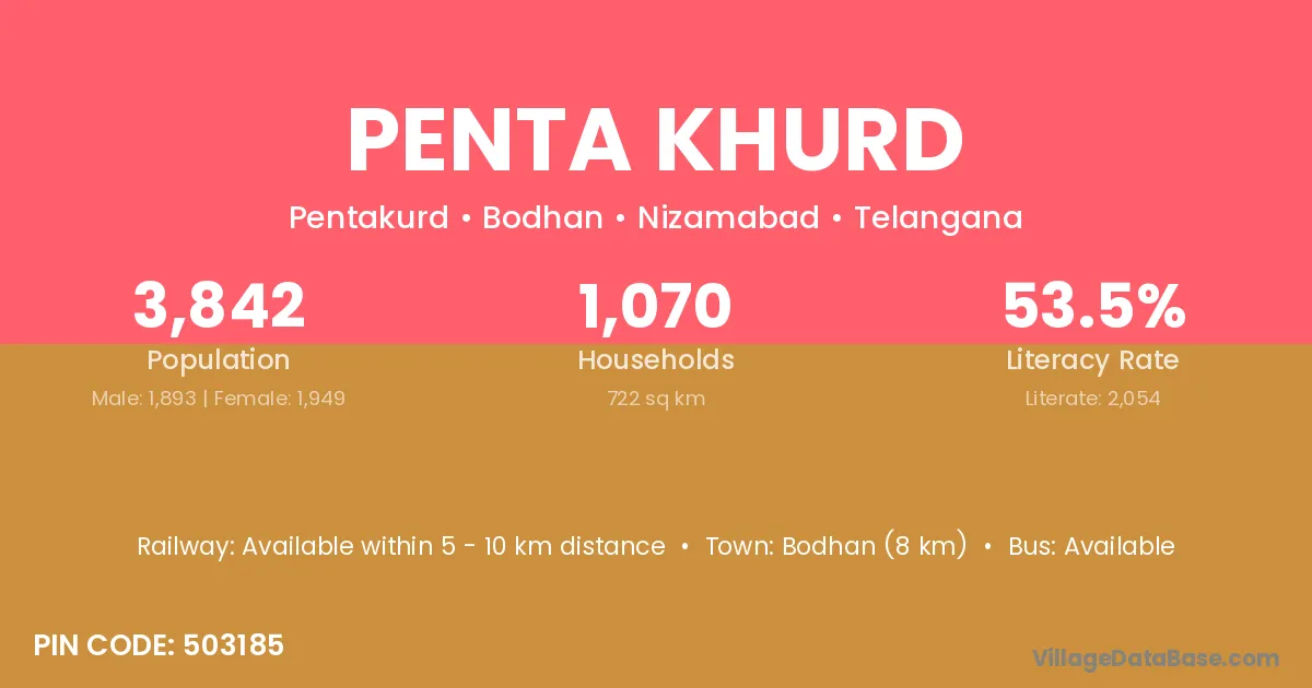 Bodhan (8 km) is the nearest town to Penta Khurd village for major economic activities and is located approximately 8 km away.