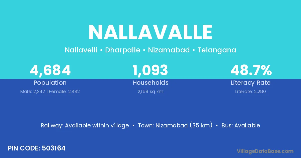 Nizamabad (35 km) is the nearest town to Nallavalle village for major economic activities and is located approximately 35 km away.