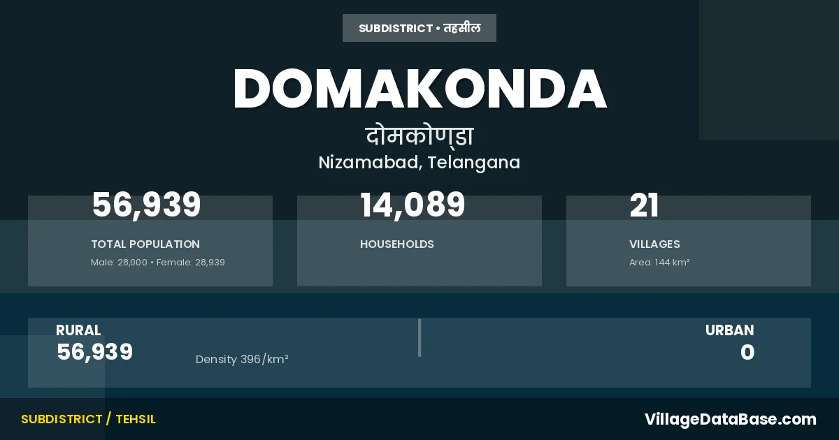 According to the 2011 census The total area of Domakonda Mandal is 144 km², with a population of 56939 people. The population density is 396 inhabitants per square kilometre, and there are approximately 14089 houses in the sub district.