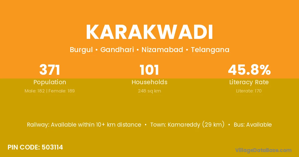Karakwadi village has a total population of 371 people, of which 182 are males and 189 are females.