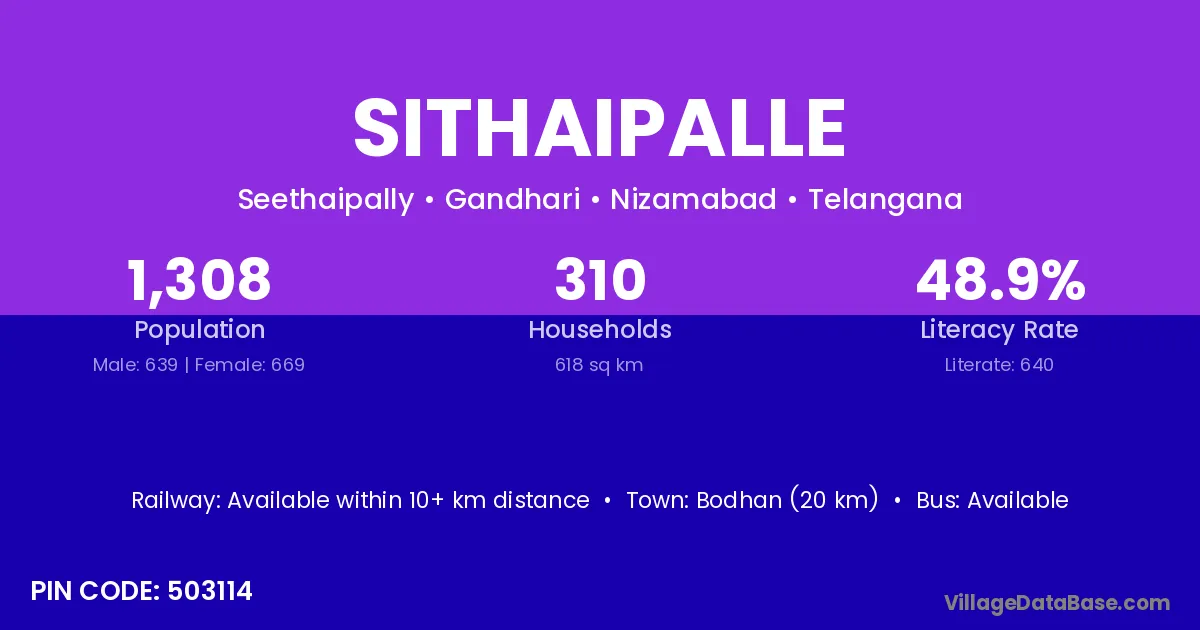 Bodhan (20 km) is the nearest town to Sithaipalle village for major economic activities and is located approximately 20 km away.
