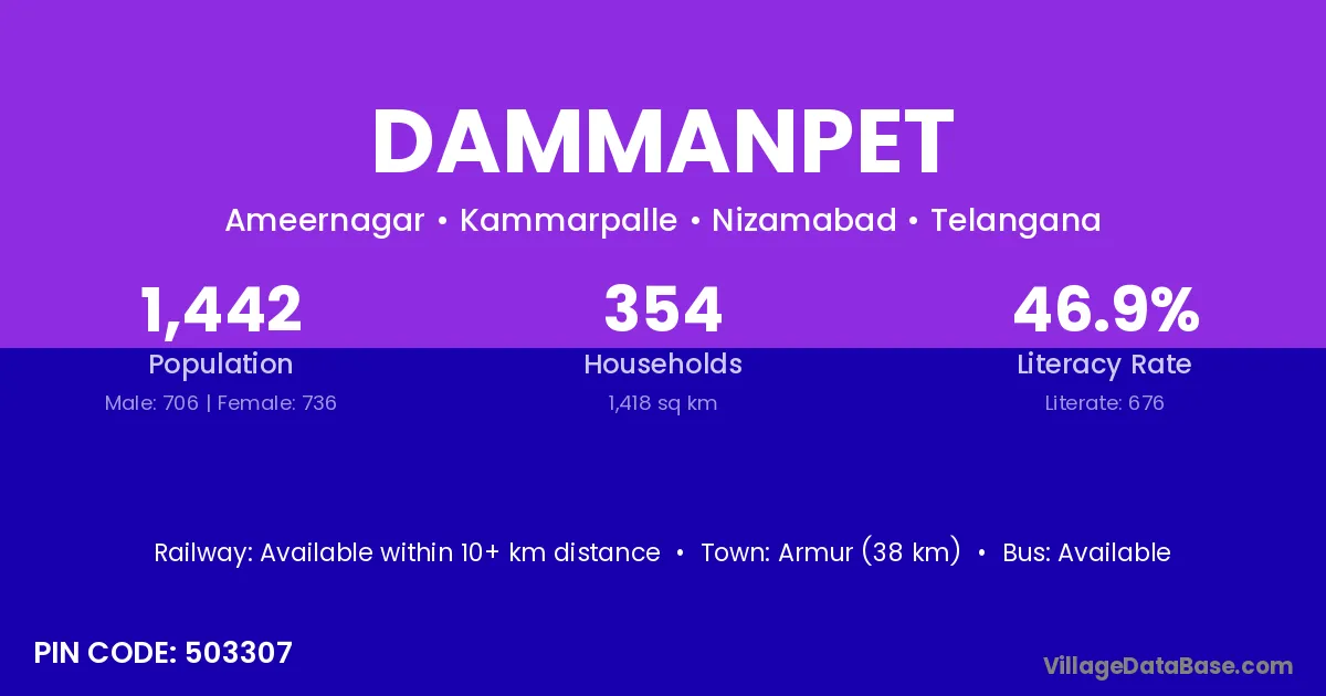 Armur (38 km) is the nearest town to Dammanpet village for major economic activities and is located approximately 38 km away.