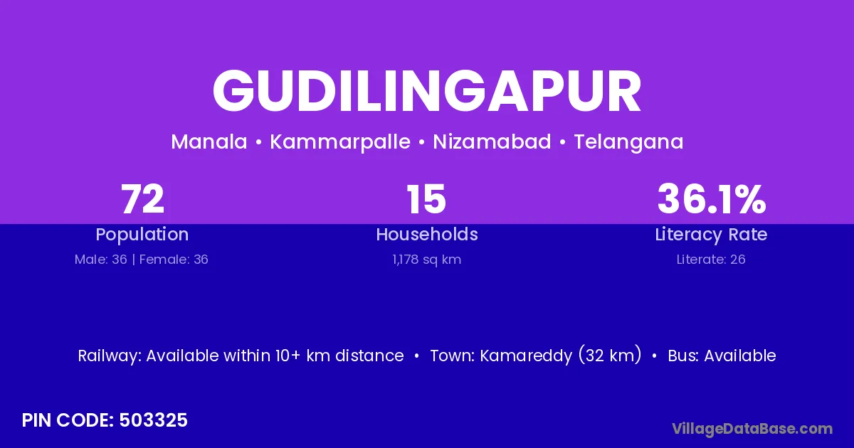 Kamareddy (32 km) is the nearest town to Gudilingapur village for major economic activities and is located approximately 32 km away.