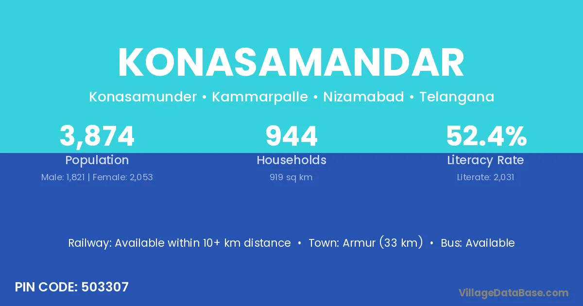 Armur (33 km) is the nearest town to Konasamandar village for major economic activities and is located approximately 33 km away.