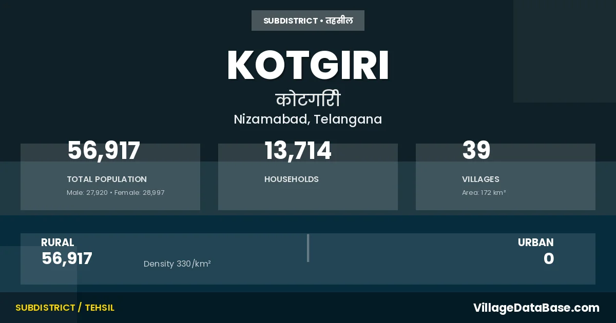 Kotgiri is a town and Mandal in the Nizamabad district of the Telangana. In India, a Mandal is a subdivision of a district responsible for the administration and revenue collection of a specific area within the district. Mandals play a crucial role in the local governance structure, contributing significantly to the development and administration of their communities.