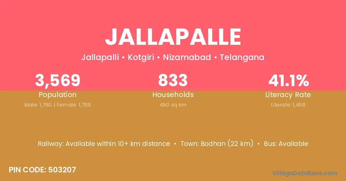 Bodhan (22 km) is the nearest town to Jallapalle village for major economic activities and is located approximately 22 km away.