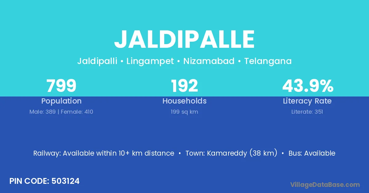Kamareddy (38 km) is the nearest town to Jaldipalle village for major economic activities and is located approximately 38 km away.