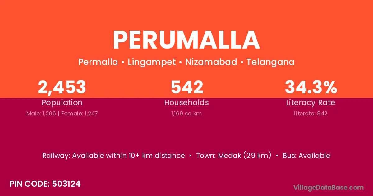 Medak (29 km) is the nearest town to Perumalla village for major economic activities and is located approximately 29 km away.